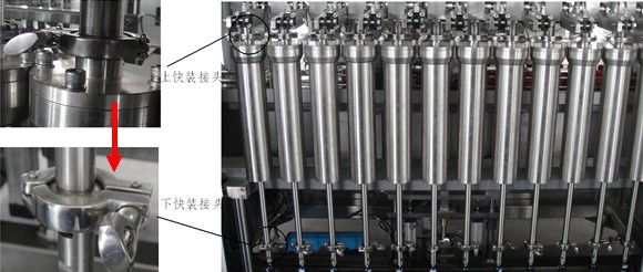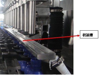 6、在灌裝頭下方安裝有Du立氣缸控制的殘留滴液收集槽,確保灌裝頭關閉后藥液不滴漏到瓶口外。