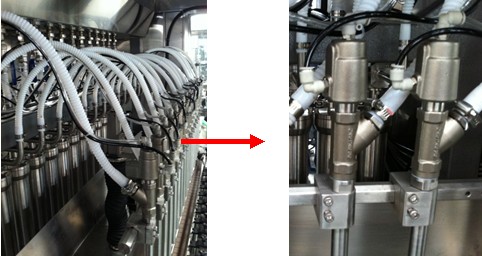4、氣缸帶動灌裝頭運行的下潛灌裝方式,配合可設定的變速灌裝功能,可降低易起泡物料在灌裝時泡沫的產(chǎn)生,防止物料外溢造成的瓶口污染。同時將灌裝頭下潛的氣缸動作機構移到積液水盤的下方,防止外濺物料對氣缸等零件的腐蝕,目前只有我公司采用這種專li機構。