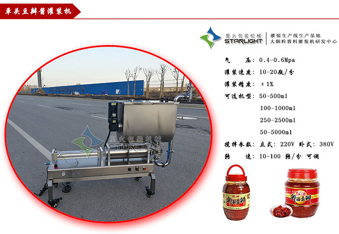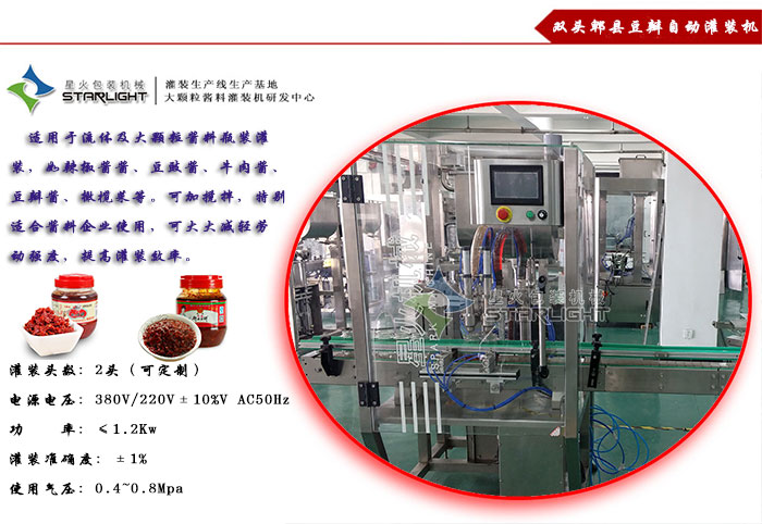 星火辣椒醬灌裝機系列是本司專門針對了紅油豆瓣醬、郫縣豆瓣、辣椒醬、牛肉醬等產(chǎn)品所設(shè)計打造的系列灌裝機設(shè)備,星火用做工精細(xì)的產(chǎn)品、考究的設(shè)備結(jié)構(gòu),獲得客戶的一致好評!“專心 專注 專業(yè),大顆粒醬料,星火更專業(yè)!”是我司的口號,曾先后服務(wù)過海底撈、李錦記、四川丹丹郫縣豆瓣醬、六必居、重慶仔、辣妹子、仲景香菇醬、老干爹等多家知名醬類生產(chǎn)企業(yè)。