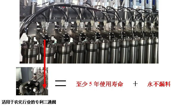3、根據(jù)高粘度灌裝機5年的研發(fā)經(jīng)驗及市場反饋,我公司自行成功研發(fā)出更適合農(nóng)化行業(yè)的灌裝三通閥。該三通閥結構簡單、性能可靠,很大的優(yōu)點在于使用壽命長,密封可靠,長時間使用后不漏料。目前該三通閥技術是我公司的特色專li。
