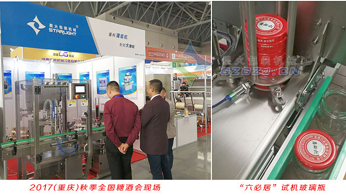星火參展2017年第97屆秋季(重慶)全國糖酒會現(xiàn)場及北京六必居食品公司采購全自動(dòng)醬料灌裝真空旋蓋生產(chǎn)線所用試機(jī)玻璃瓶。