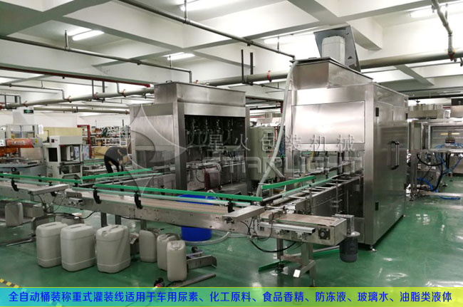 星火全自動車用尿素灌裝機車間(該全自動大桶裝車用尿素溶液灌裝機適用于車用尿素、化工原料、食品香精、防凍液、玻璃水、油脂油料、水質(zhì)改良凈化液、汽車用尿素,尿素水、尿素溶液等液體及具有流動性的膏體物料。)