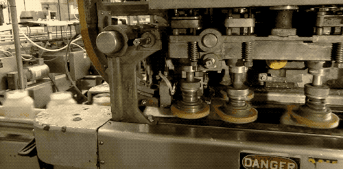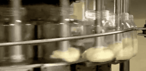 旋轉(zhuǎn)多頭灌裝機(jī):底下的流水線走塑料罐,上面灌蛋黃醬,0.25 秒就能裝滿一個 600 毫升的大罐子,再看這么多的灌裝頭,可見生產(chǎn)速度和產(chǎn)量非常驚人。